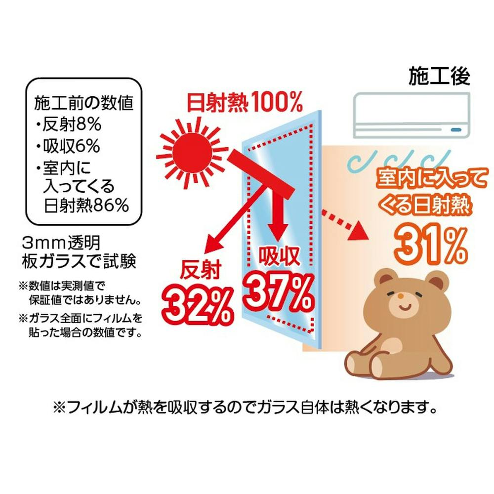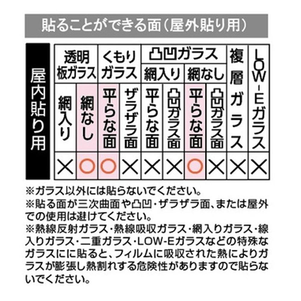 ●ガラスにヒビが入る場合がありますので、熱線反射、熱線吸収、網入り、線入り、二重、複合、ペアガラスなどの特殊なガラスにはお貼りにならないでください。