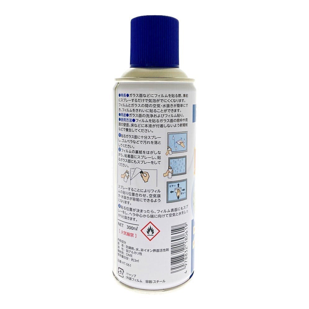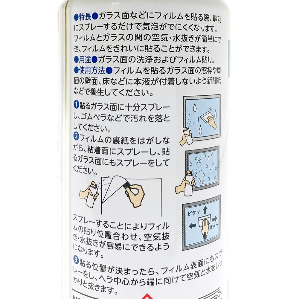 ガラス面などにフィルムを貼る際、事前にスプレーするだけで気泡がでにくくなります。フィルムとガラスの間の空気・水抜きが簡単にでき、フィルムをきれいに貼ることができます