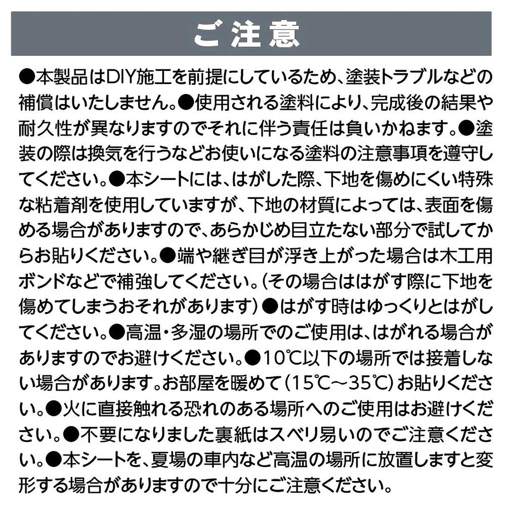 用途に合った塗料をお選びください。本シートをはがした際に下地を痛めにくい粘着剤を使用していますが、あらかじめ目立たない場所で試してください。はがれてくる場合は壁紙用ボンドなどで補強してください。高温多湿を避け15~35℃の室温でお貼りください。
