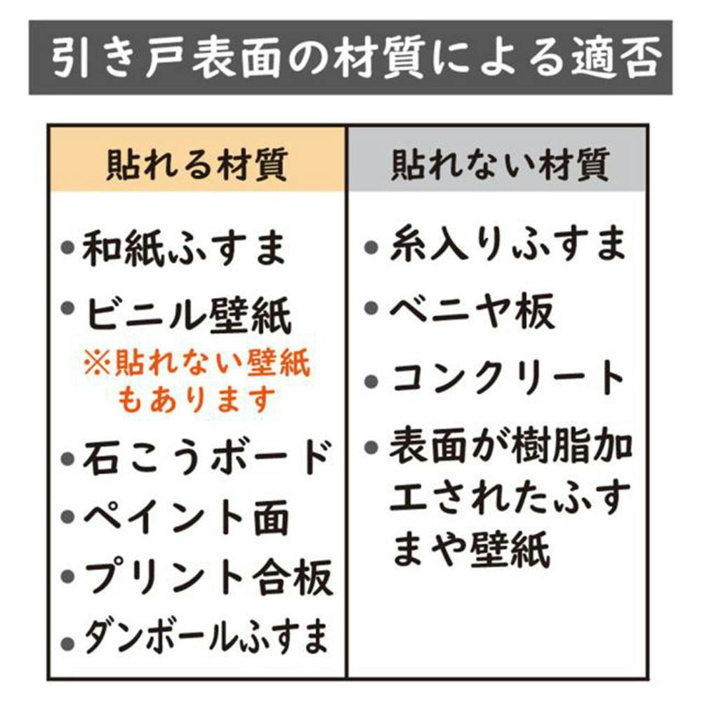 ●引き戸表面の材質により貼れない場合がございます。貼れる面の適否をご確認ください。●下地が凹凸の場合はきれいに仕上がりませんので、下地調整(補修)後、貼ってください。●古い壁紙、壁紙表面が砂壁のようなザラザラした模様の面には貼れません。など