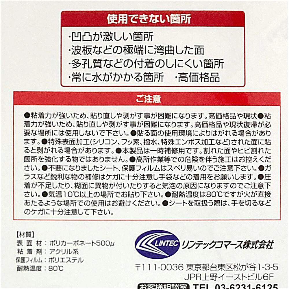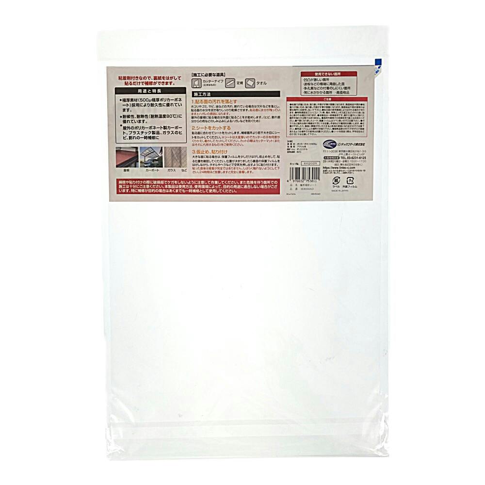 ●500μ極厚ポリカーボネート採用により、耐久性に優れ衝撃に強く外気にさらしても劣化しにくいシートです。 ●対候性・耐熱性(耐熱温度80℃)に優れています。 ●保護フィルムをはがして貼るだけで補修ができます。 ●湾曲した面にも貼りつくので、多用途使用ができます。