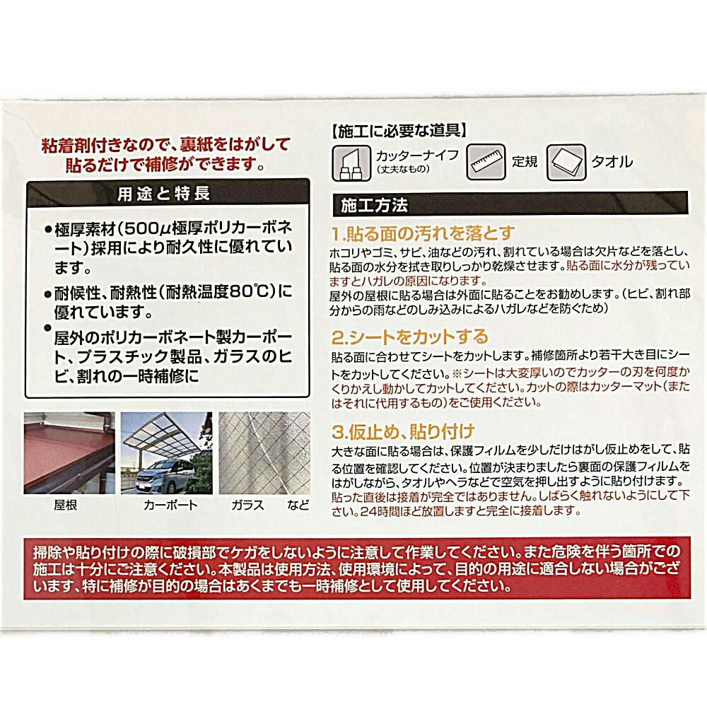 屋外のポリカーボネート製カーポート、プラスチック製品、ガラスのヒビ、割れの一時補修などに貼れる極厚保護補修シートです。