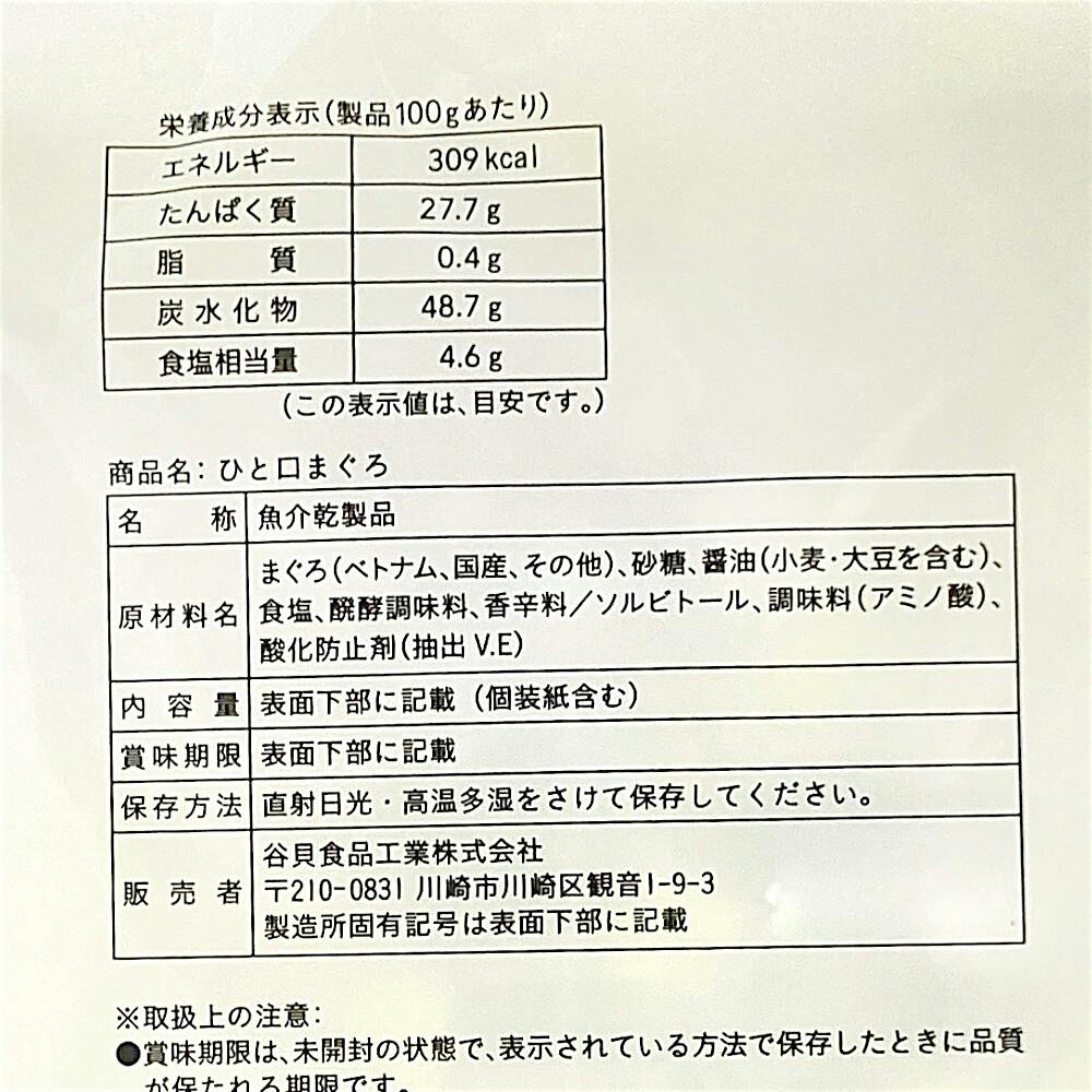 まぐろ(ベトナム、国産、その他)、砂糖、醤油(小麦、大豆を含む)、食塩、醗酵調味料、香辛料/ソルビトール、調味料(アミノ酸)、酸化防止剤(抽出V.E)