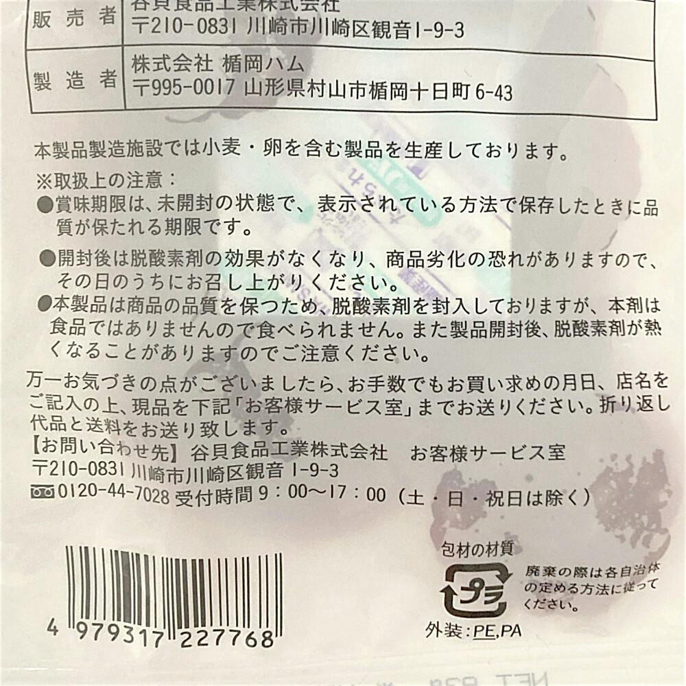 鶏肉(国産)、畜肉(豚肉、馬肉)、豚脂肪、結着材料(大豆たん白、乳たん白)、糖類(水あめ、砂糖)、食塩、香辛料/トレハロース、調味料(アミノ酸等)、リン酸塩(Na)、酸化防止剤(ビタミンC)、発色剤(硝酸K、亜硝酸Na)、香辛料抽出物、(一部に乳成分・鶏肉・豚肉・大豆を含む)
