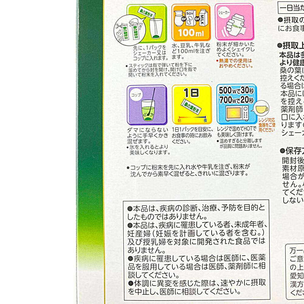 ●たんぱく質、食物繊維、カルシウム、亜鉛を含み、桑の葉特有の飲みやすいスティックタイプのおいしい青汁です。皆様の健康維持に役立ちます。