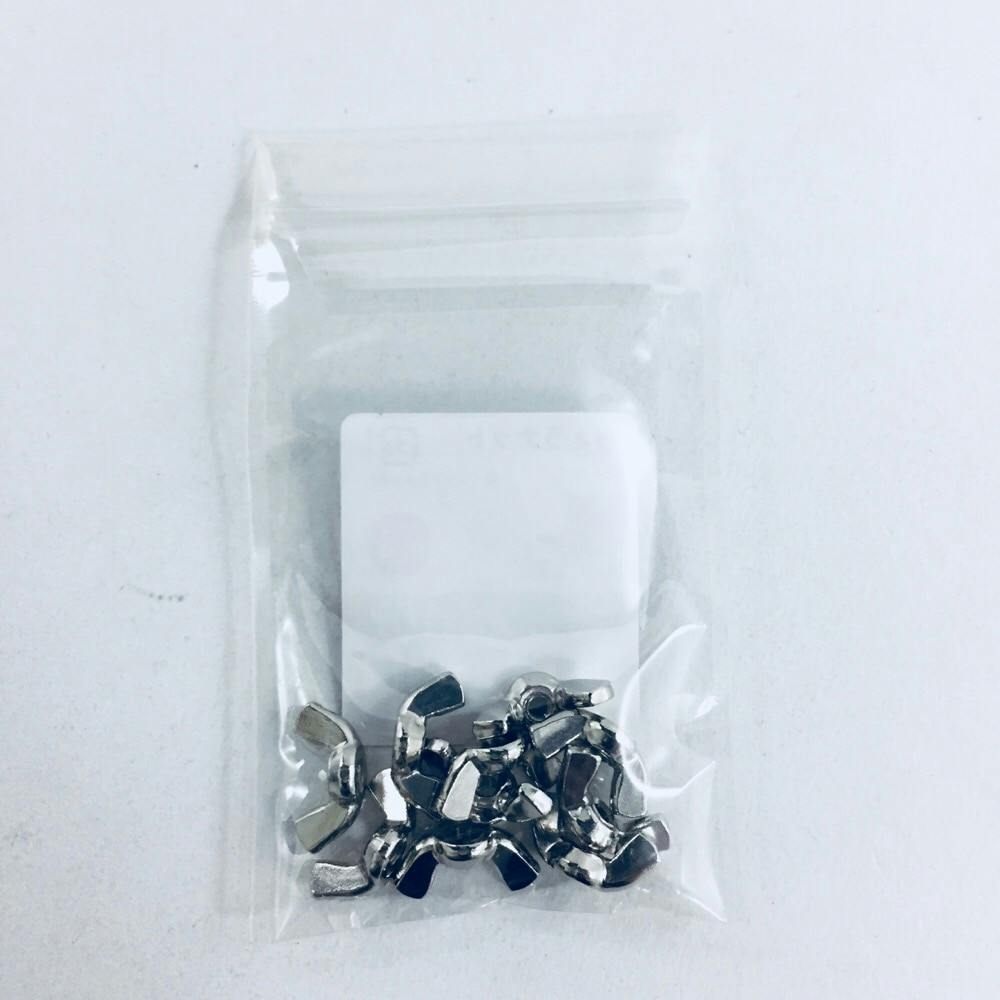 蝶の羽根のように加工したナットで、手で締付けたりゆるめたりできます。材質は鋼で耐食性向上のため、ニッケルめっき(白っぽい色合い)がしてあります。