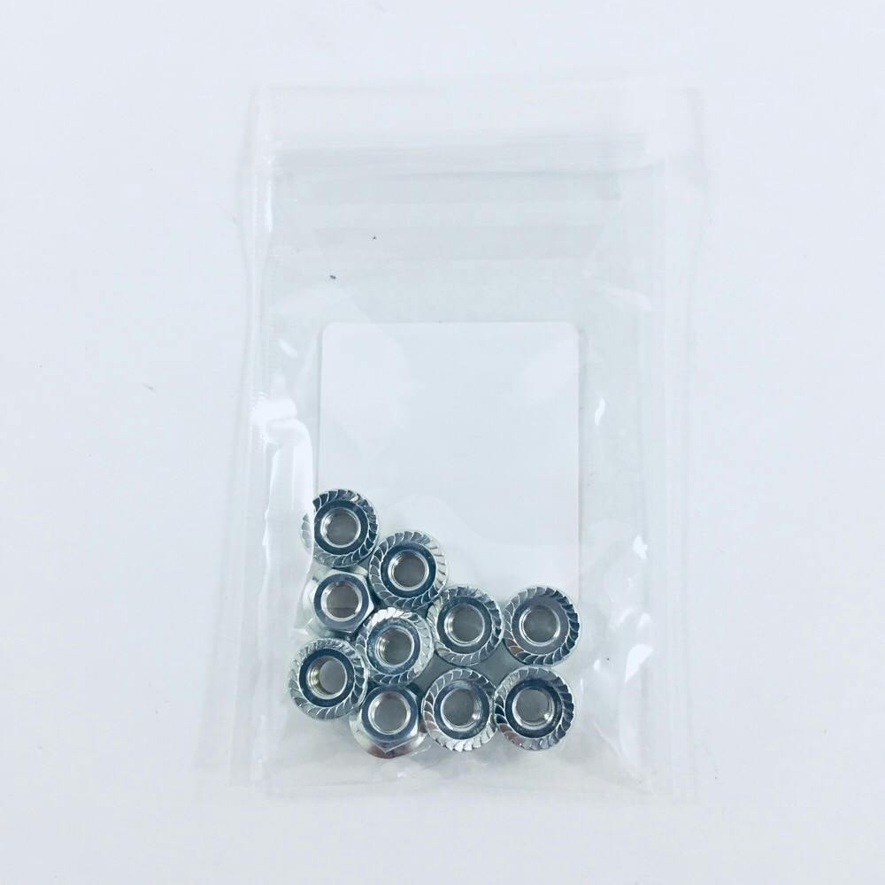 フランジ部が冷間圧造された六角ナットで、座面に加工されたセレートが、ゆるみ止めとして作用します。材質は鋼で耐食性向上のため、クロメートめっき(黄色っぽい色合い)がしてあります。
