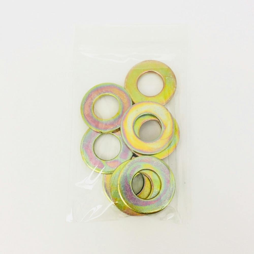JIS規格の平座金です。呼び径は使用するおねじの径でワッシャーの内径は若干大きめの穴が開いています。材質は鋼で耐食性向上のため、クロメートめっき(黄色っぽい色合い)がしてあります。