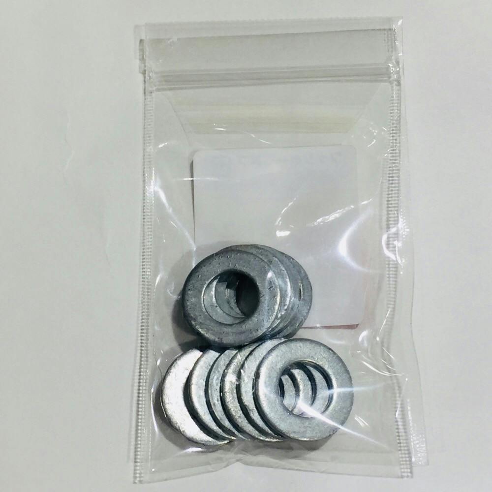 JIS規格の平座金です。呼び径は使用するおねじの径でワッシャーの内径は若干大きめの穴が開いています。材質は鋼で耐食性向上のため、溶融亜鉛めっき(白っぽい色合い)がしてあります。