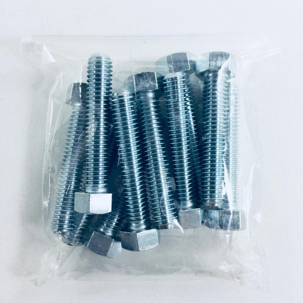 ウイットねじの六角ボルトで胴の全体にねじが切ってあります。材質は鋼で耐食性向上のため、ユニクロめっき(薄青っぽい色合い)がしてあります。