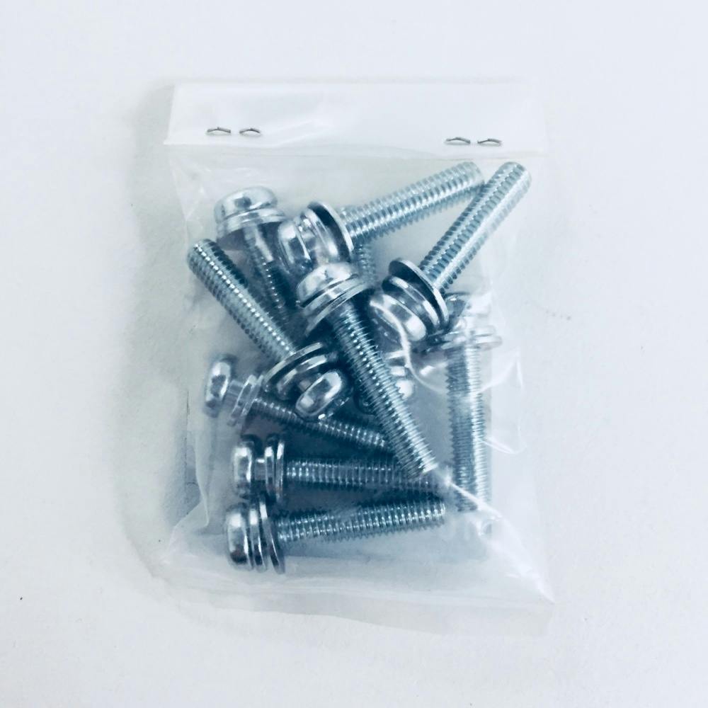 十字穴付なべ小ねじにばね座金と平座金が組込まれており、脱落しません。組込み式なので作業効率が向上します。材質は鋼で耐食性向上のため、三価クロメートめっき(薄青っぽい色)がしてあります。規格はJIS B 1188 をご覧ください。