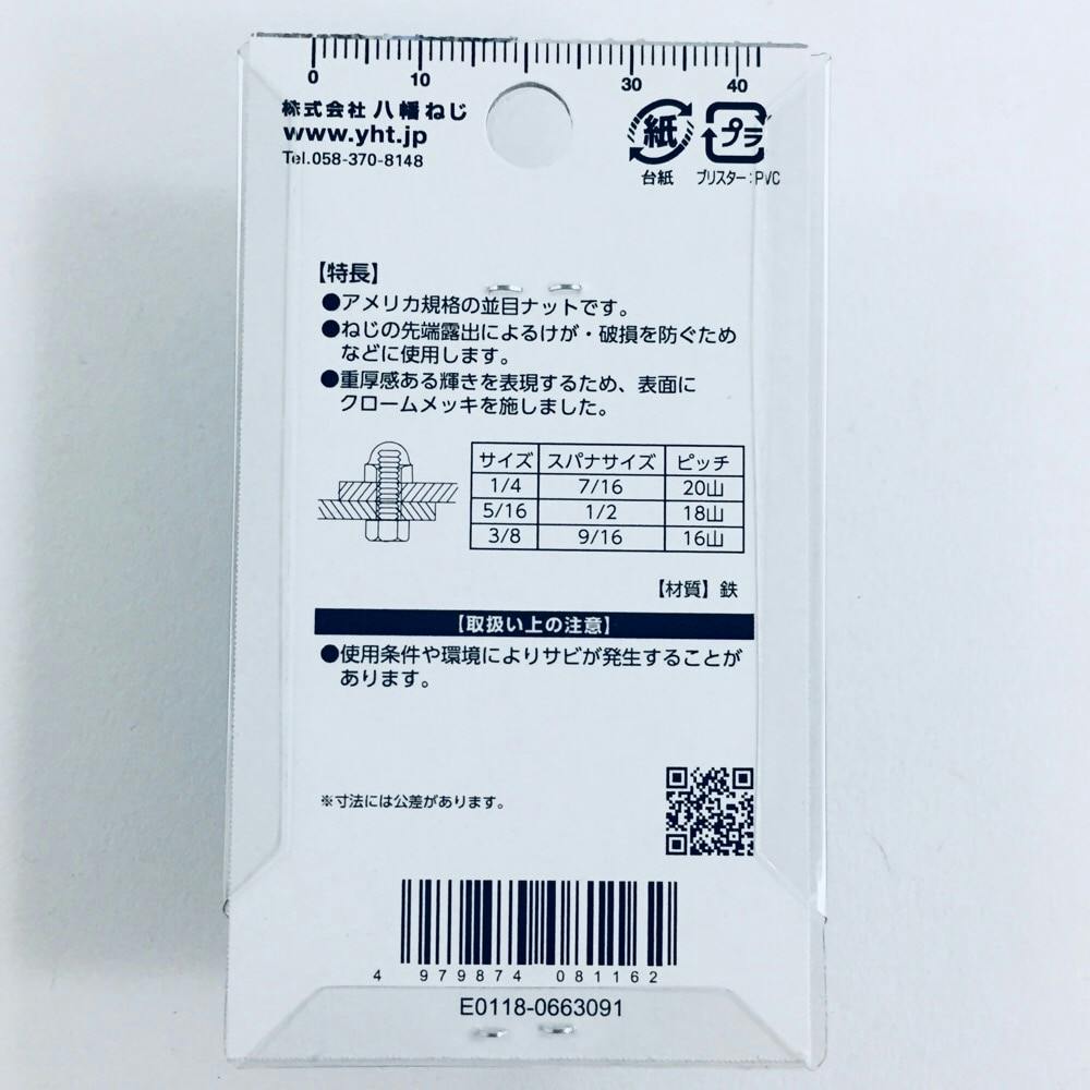六角ナットの片面がキャップ状で、ボルトと締結後ねじ部が覆われるので見た目がきれいで、引っかかりにくく安全です。材質は鋼で耐食性向上のため、クロームめっき(白っぽく光沢のある)がしてあります。