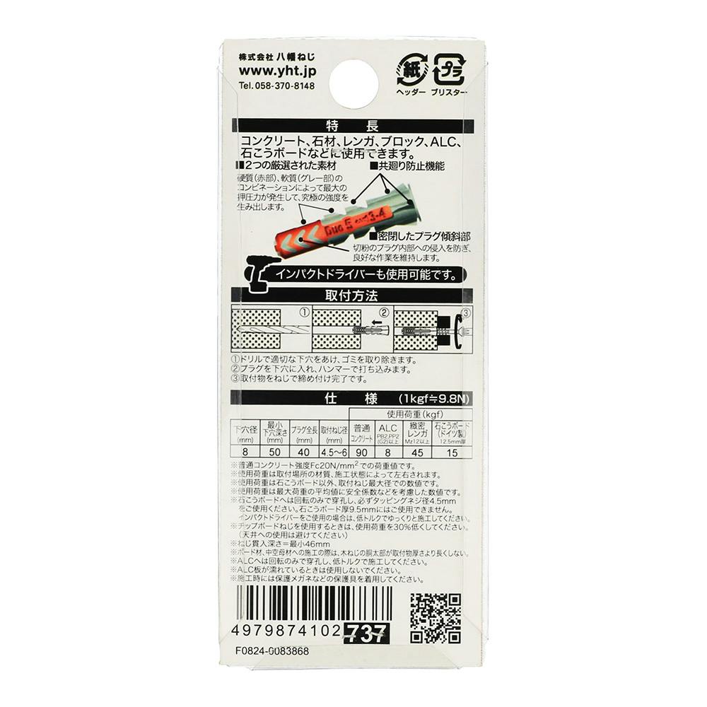 ●サイズ/下穴径:8mm、最小下穴深さ:50mm、プラグ全長:40mm、取付ねじ径:4.5~6mm