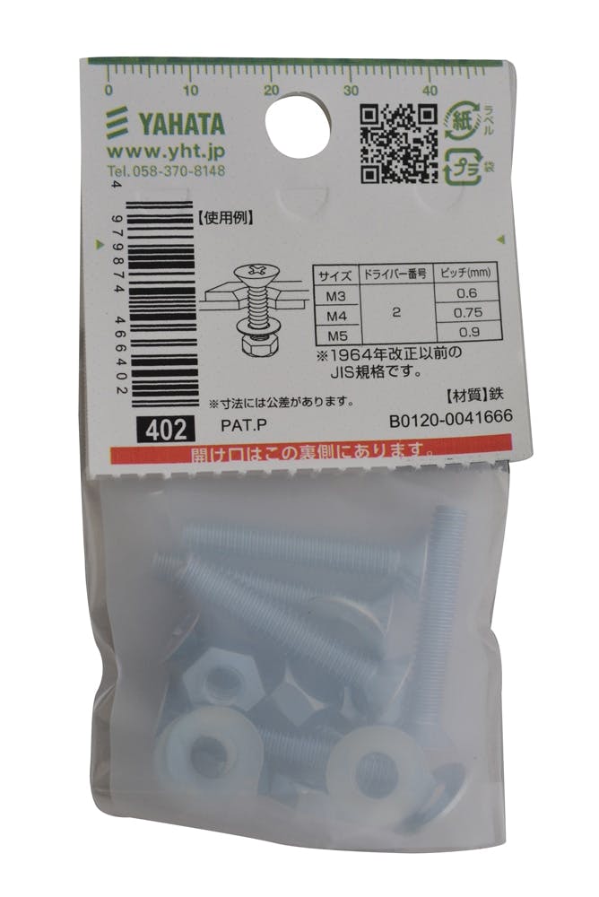 材質は鋼でユニクロめっき(薄青っぽい色合い)がしてあります。1964年改正以前のJIS規格です。ねじの規格はJIS B 0205-1957。現在、ほとんど流通していません。