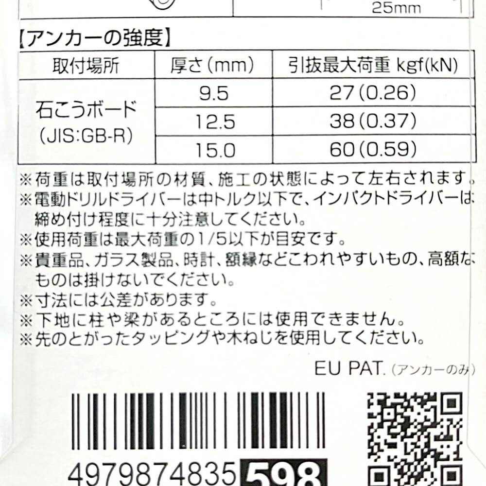 アンカーの強度/(取り付け場所:石膏ボード(JIS:GB-R))、9.5mm: 27(0.26)/12.5mm:38(0.37)/15.0:60(0.59)※厚さ:引抜最大荷重kgf(kN)