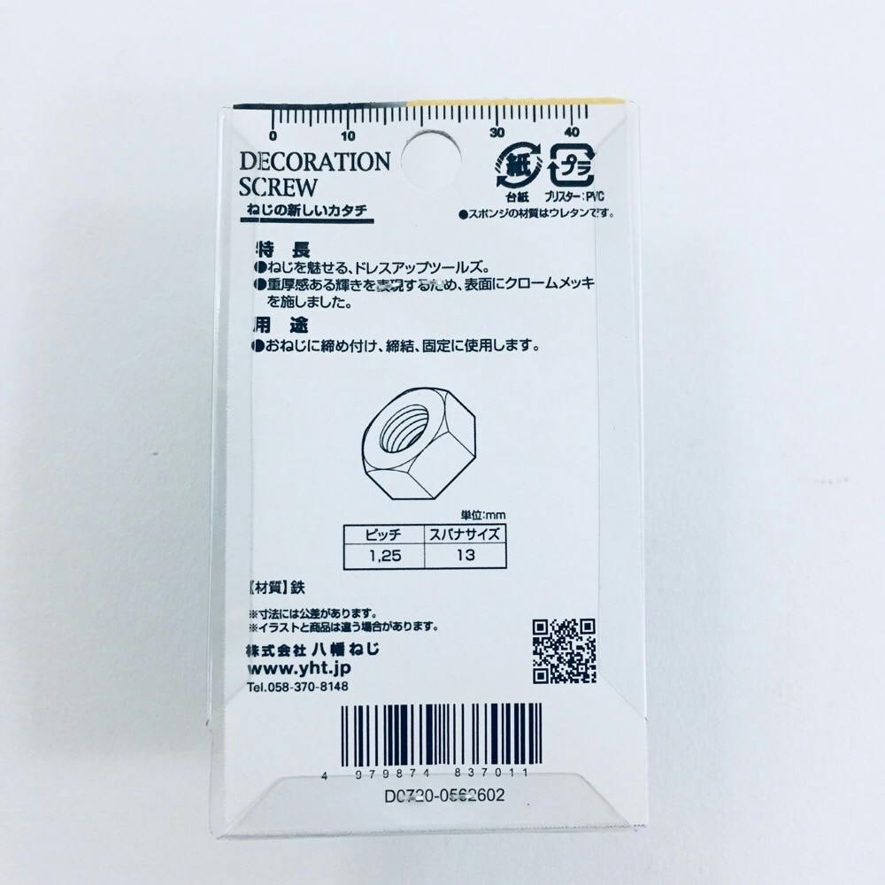 材質は鋼で外観、耐食性向上のため、クロームめっき(白っぽく光沢のある)がしてあります。生地に比べ耐食性があります。1種(片面取り)の一般的な六角ナットで、高さは呼び径の8割です。冷間圧造製品です。