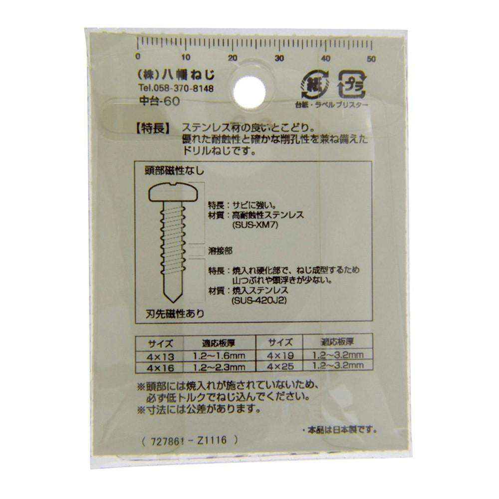 ●締付けねじ部と頭部は、SUS305ステンレス鋼、タッピングねじ部とドリル先は焼入鉄の複合金属製のため、耐食性に優れたドリルねじです。●製品の特性上、磁石に付きます。●頭部には焼入れが施されていない為、必ず低トルクで締付けてください。