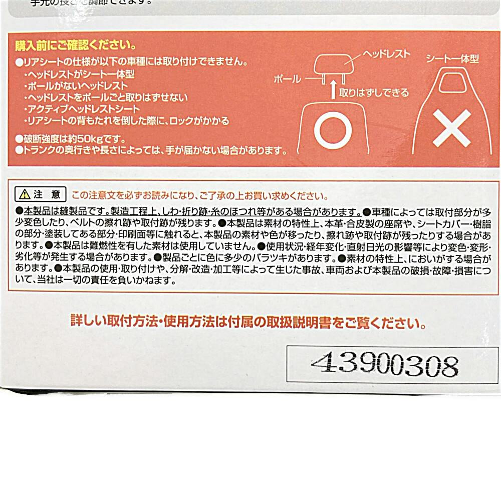 ●リアシートを簡単に引き起こすことができます。●ヘッドレストポールに取り付けるだけの簡単装着です。●さまざまな車種に対応します。●普段はハトメ穴にカラビナを付けてフックとして使用できます。