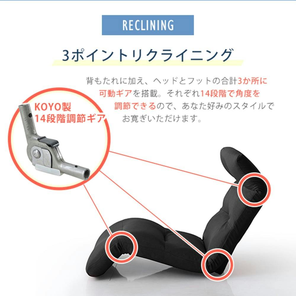 ●頭部・背もたれ・脚部がそれぞれ14段階リクライニングするので自分の好みのポジションでリラックス出来ます●脚部が下にリクライニングするので自然に脚を伸ばしてくつろげます●背もたれを折りたためばコンパクトになり、収納にも便利です