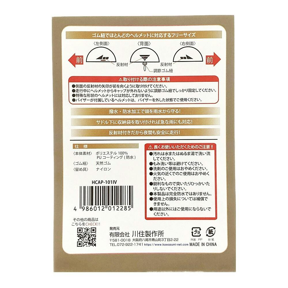 ●撥水・防水加工で頭を雨水から守る ●サドル下に収納袋を取り付ければ急な雨にも対応 ●反射材付きだから夜間も安全に走行