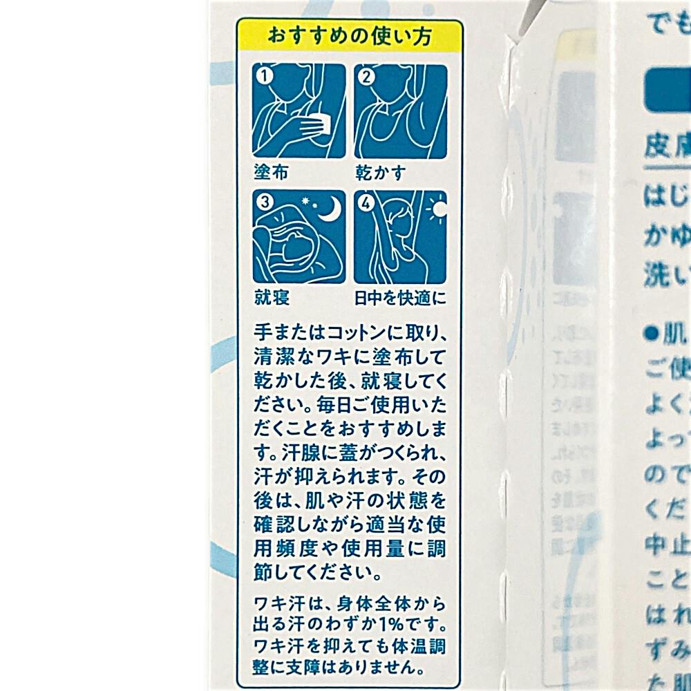 ●適量を手またはコットンに取り、清潔なワキに塗布して乾かした後、就寝してください。毎日ご使用いただくことをおすすめします ●汗腺に蓋が作られ、汗が抑えられます ●その後は汗や肌の状態を確認しながら適当な使用頻度や使用量に調節してください