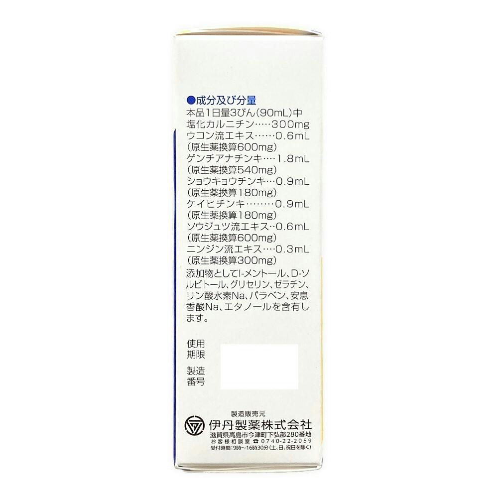 本品1日量3びん(90mL)中/塩化カルニチン:300mg、ウコン流エキス:0.6mL(原生薬換算600mg)、ゲンチアナチンキ:1.8mL(原生薬換算540mg)、ショウキョウチンキ:0.9mL(原生薬換算180mg)、ケイヒチンキ:0.9mL(原生薬換算180mg)、ソウジュツ流エキス0.6mL(原生薬換算600mg)、など