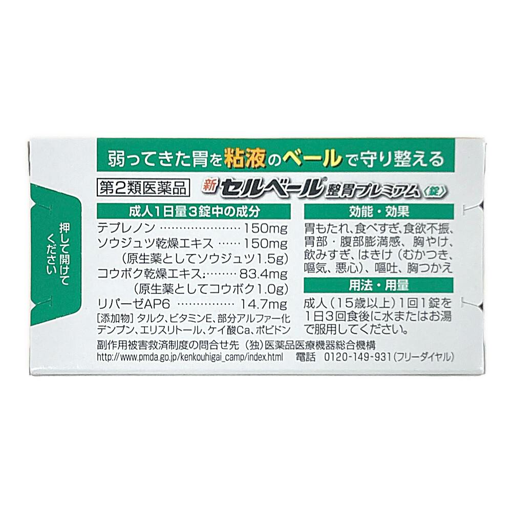 成人1日量3錠中の成分/テプレノン:150mg、ソウジュツ乾燥エキス:150mg(原生薬としてソウジュツ1.5g)、コウボク乾燥エキス:83.4mg(原生薬としてコウボク1.0g)、リパーゼAP6:14.7mg