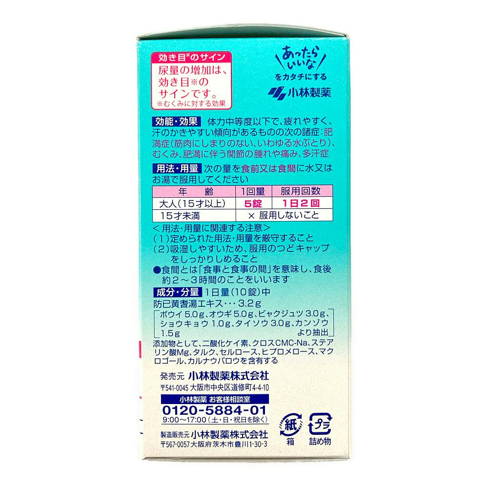 1日量(10錠)中/防已黄耆湯エキス:3.2g(ボウイ5.0g、オウギ5.0g、ビャクジュツ3.0g、ショウキョウ1.0g、タイソウ3.0g、カンゾウ1.5gより抽出)