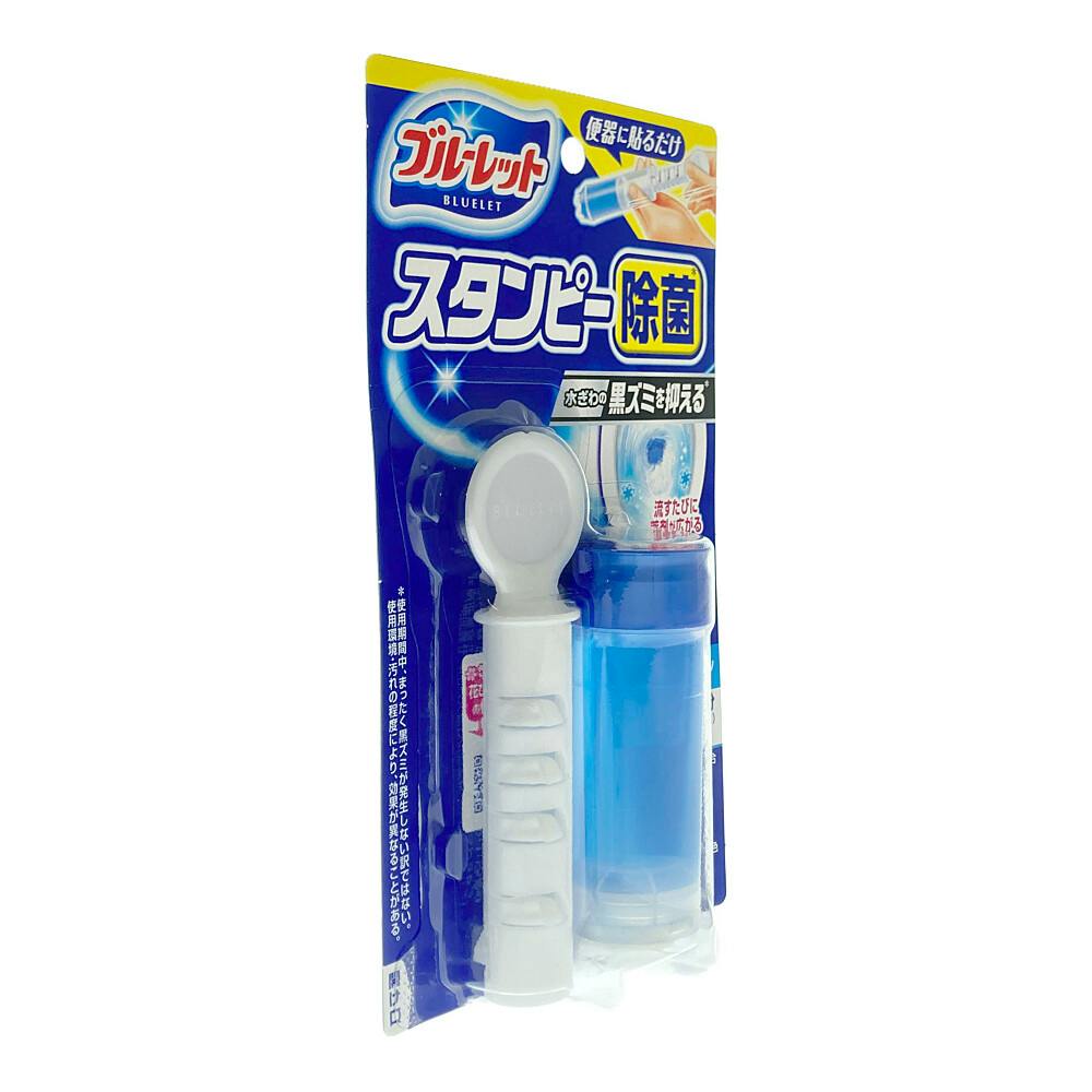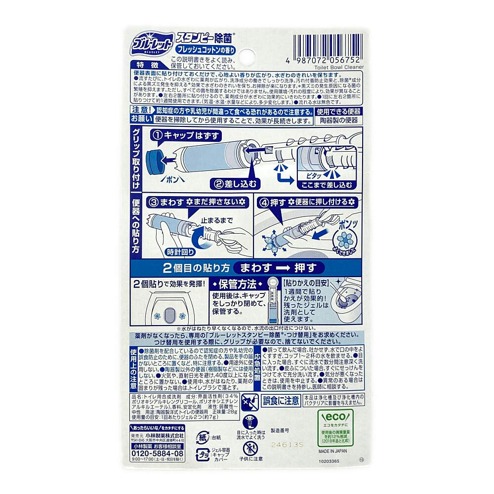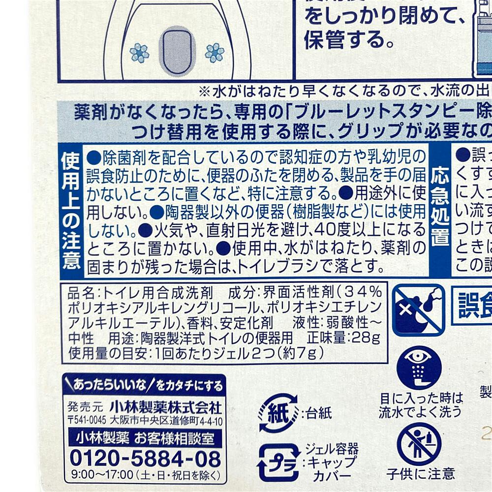 ●流れる水は無色です ●1週間で貼りかえが効果的!残ったジェルは洗剤として使えます ●薬剤がなくなったら、専用の「ブルーレットスタンピー除菌・つけ替用」をお求めください(つけ替用を使用する際に、グリップが必要なので、捨てないでください)