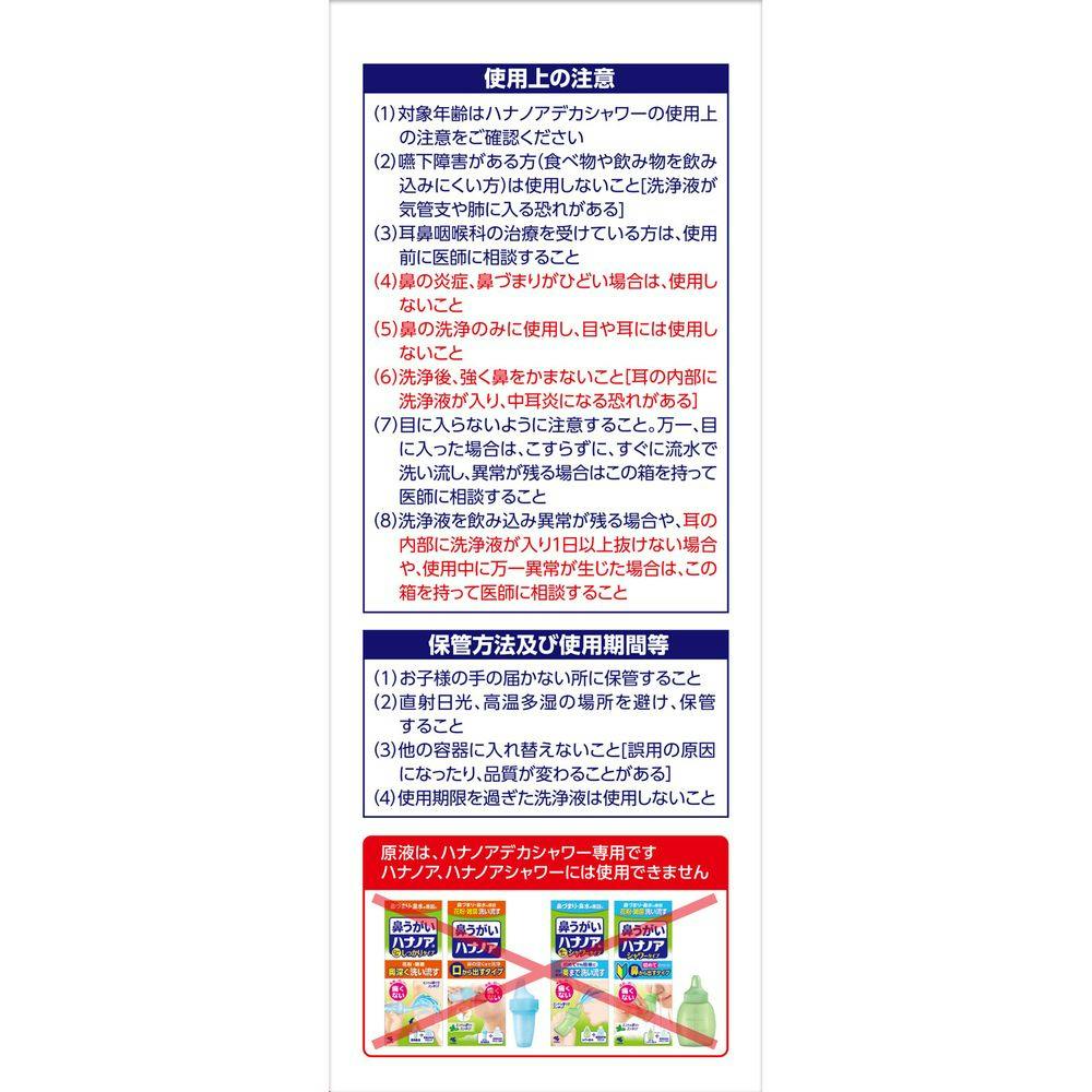 ●原液は、ハナノアデカシャワー専用です。ハナノアa、ハナノアb(シャワータイプ)には使用できません。●国内のキレイな水道水で薄めてください。●鼻の洗浄のみに使用し、目や鼻には使用しないこと。等