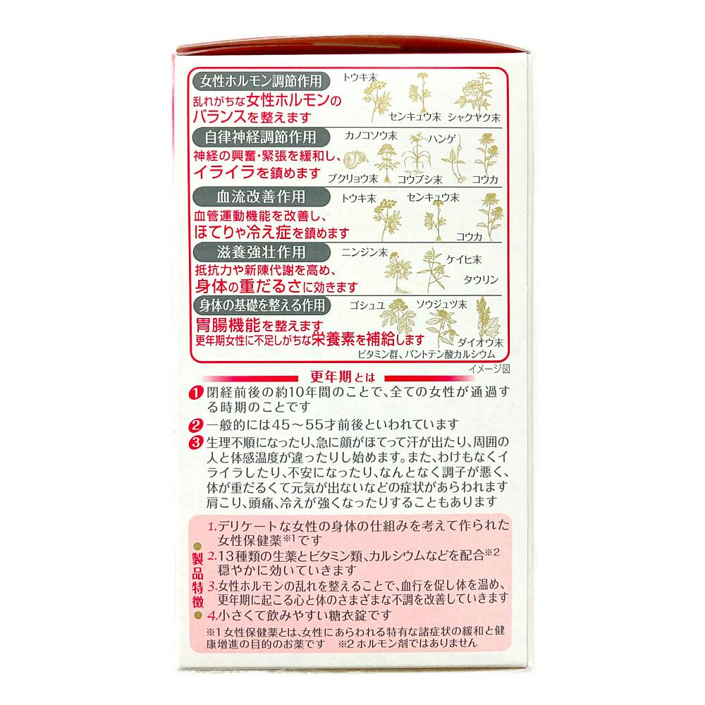 ●デリケートな女性の身体の仕組みを考えて作られた女性保健薬です。●13種類の生薬とビタミン類、カルシウムなどを配合。穏やかに効いていきます。●女性ホルモンの乱れを整えることで、血行を促し体を温め、更年期に起こる心と体のさまざまな不調を改善していきます。