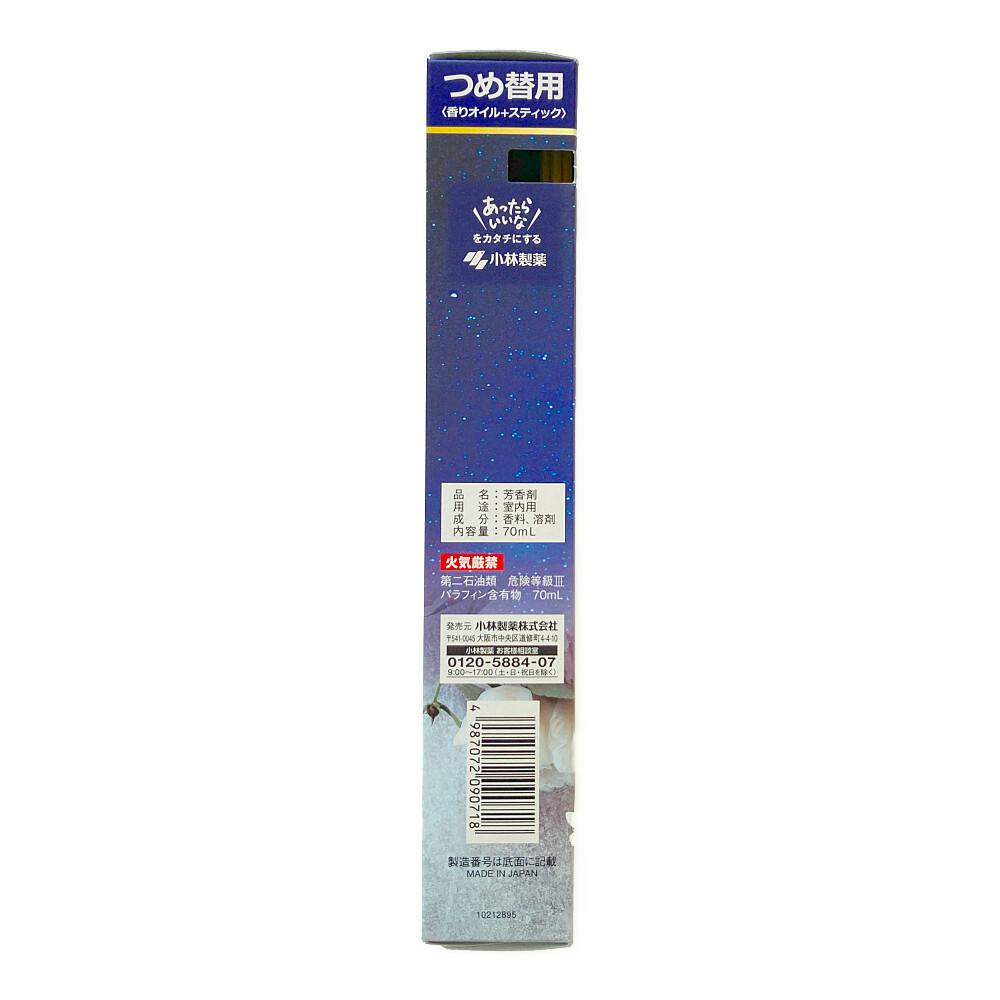 つめ替方法/香りのオイルが全てなくなってからつめ替える。1.使用済みのスティックを直接触らないようにティッシュなどを使って捨てる。2.ガラス容器を平らで安定した場所に置き、香りオイルの注ぎ口を差し込んで液を全て注ぐ。等
