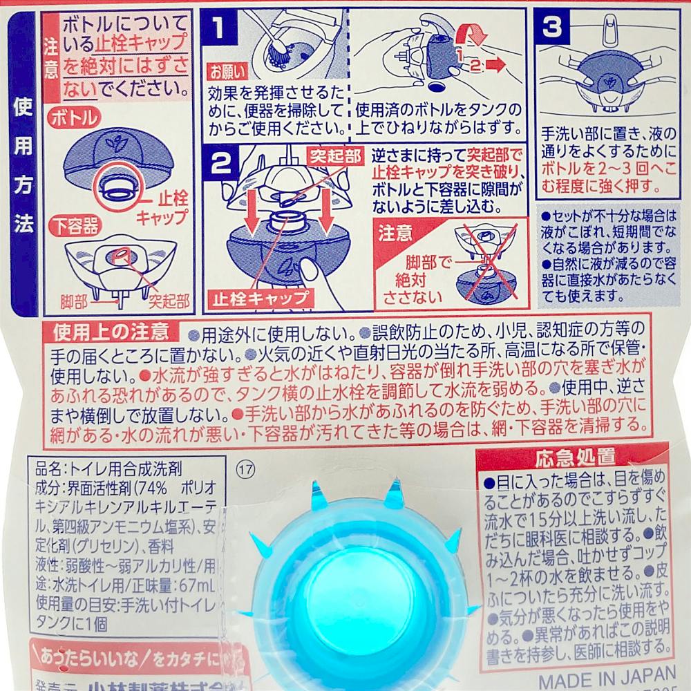●本品はタンク内の器具、便器、浄化槽及び浄化槽内のバクテリアへの影響に配慮し設計しています●セットが不十分な場合は液がこぼれ、短期間でなくなる場合があります。●自然に液が減るので容器に直接水があたらなくても使えます。