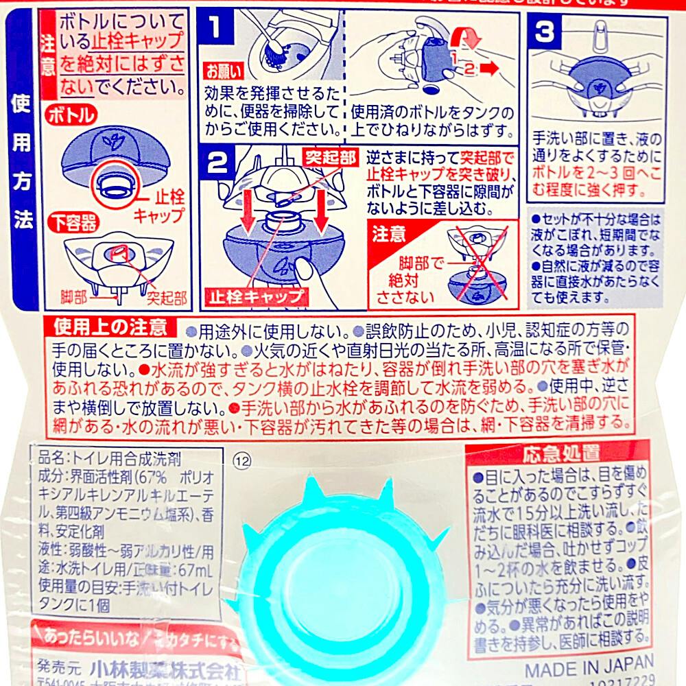 使用方法/●注意:ボトルについている止栓キャップは絶対にはずさないでください。1.お願い:効果を発揮させるために、便器を掃除してからご使用ください。使用済のボトルをタンクの上でひねりながらはずす。等