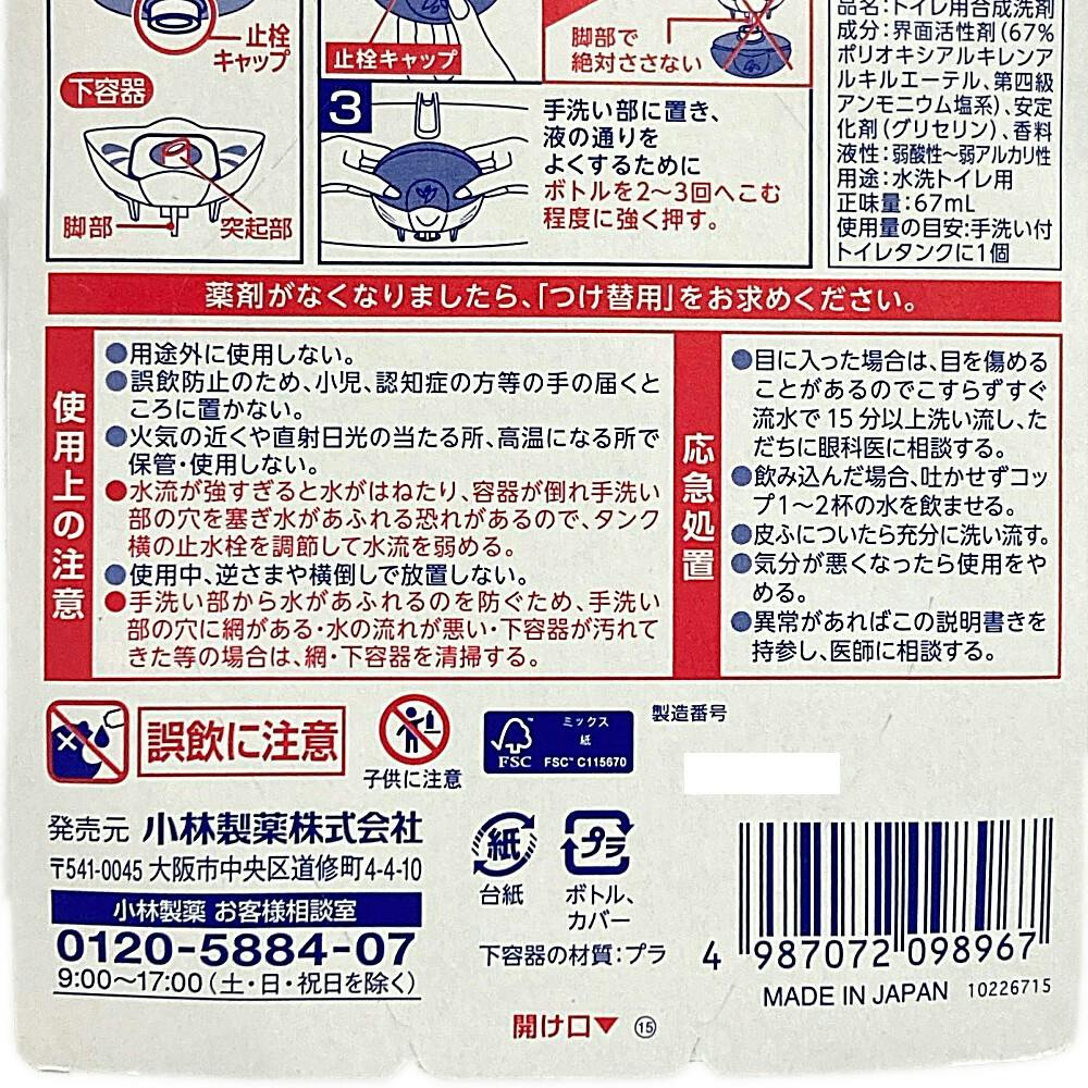 ●便器やタンクに影響を与えません ※本品はタンク内の器具、便器、浄化槽及び浄化槽内のバクテリアへの影響に配慮し設計しています ●使用量の目安:手洗い付タンクに1個