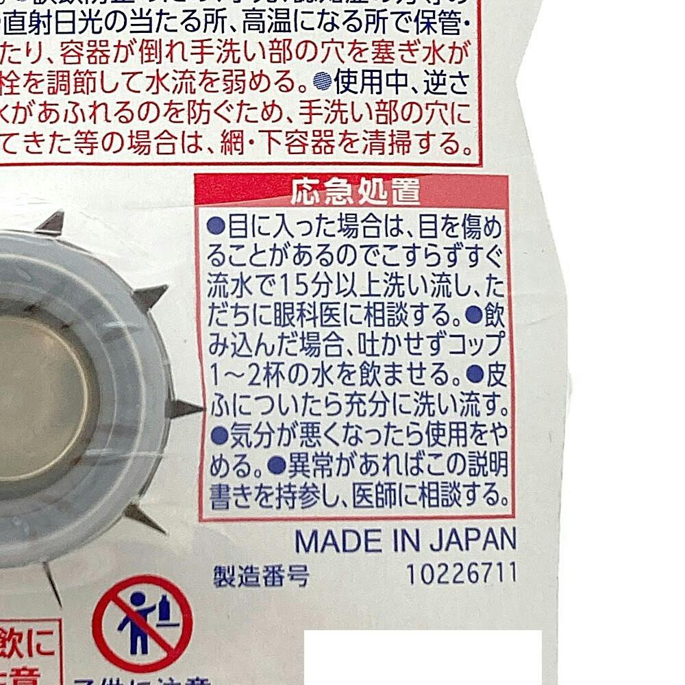 ●用途外に使用しない ●誤飲防止のため、小児、認知症の方等の手の届くところに置かない。●火気の近くや直射日光の当たる所、高温になる所で保管・使用しない。●使用中、逆さまや横倒しで放置しない。など