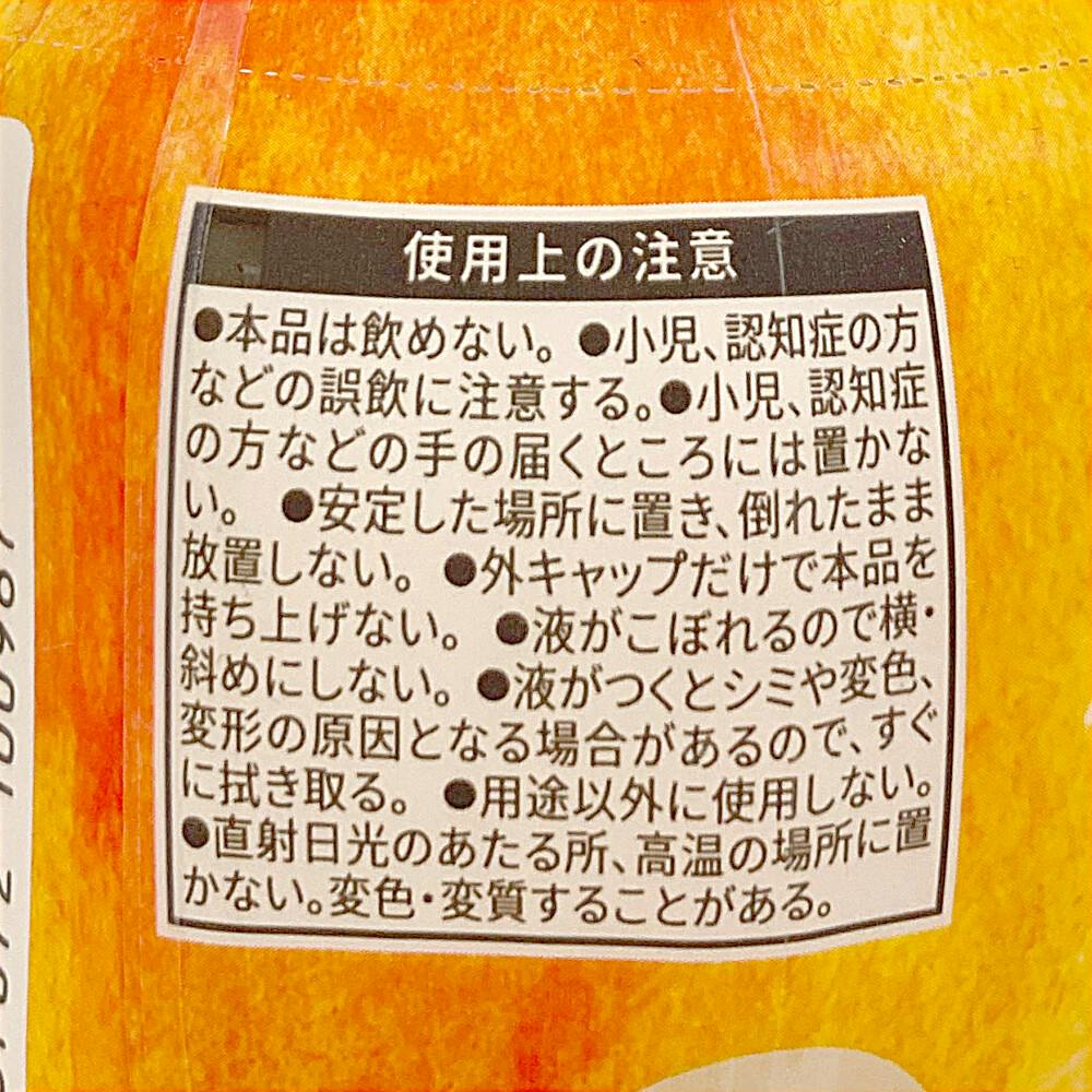 ●本品は飲めない。●小児、認知症の方などの誤飲に注意する。●小児、認知症の方などの手の届くところには置かない。●安定した場所に置き、倒れたまま放置しない。●外キャップだけで本品を持ち上げない。●液がこぼれるので横・斜めにしない。など