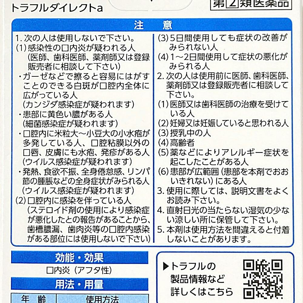 ●次の人は使用しないで下さい/1.感染性の口内炎が疑われる人(医師、歯科医師、薬剤師又は登録販売者に相談して下さい)。2.ガーゼなどで擦ると容易にはがすことのできる白斑が口腔内全体に広がっている人(カンジダ感染症が疑われます)。等