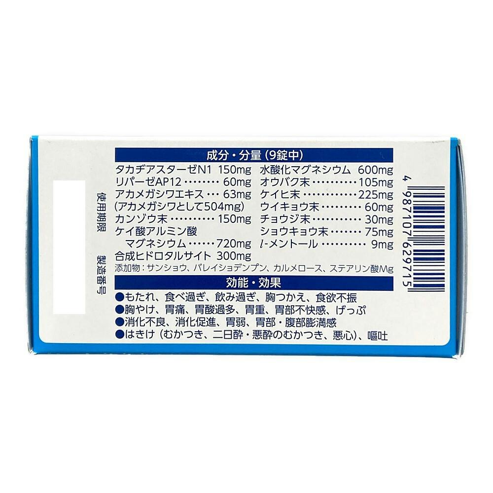 9錠中/タカヂアスターゼN1:150mg、リパーゼAP12:60mg、アカメガシワエキス:63mg(アカメガシワとして504mg)、カンゾウ末:15mg、ケイ酸アルミン酸マグネシウム:720mg、合成ヒドロタルサイト:300mg、水酸化マグネシウム:600mg、など
