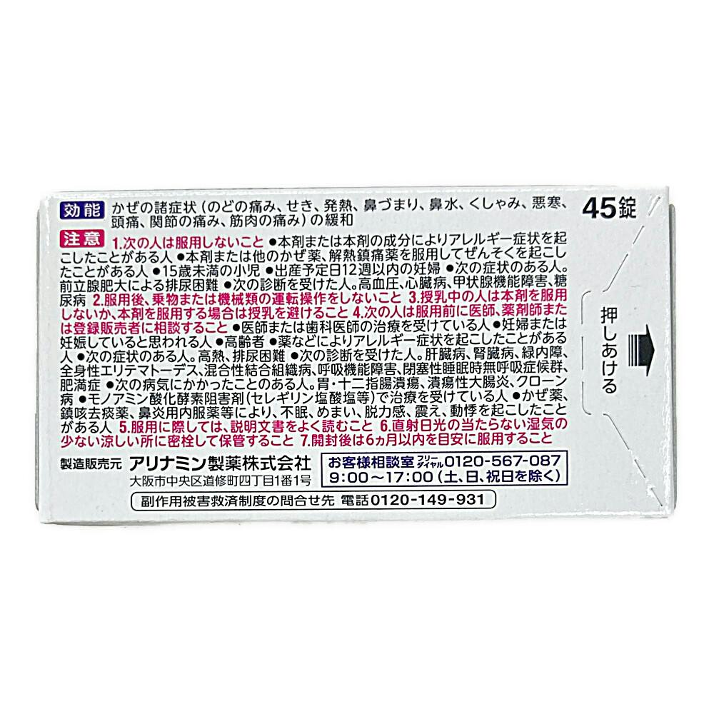 9錠(1日服用量)中イブプロフェン:450mg、塩酸プソイドエフェドリン:135mg、クロルフェニラミンマレイン酸塩:7.5mg、ジヒドロコデインリン酸塩:24mg、無水カフェイン:75mg