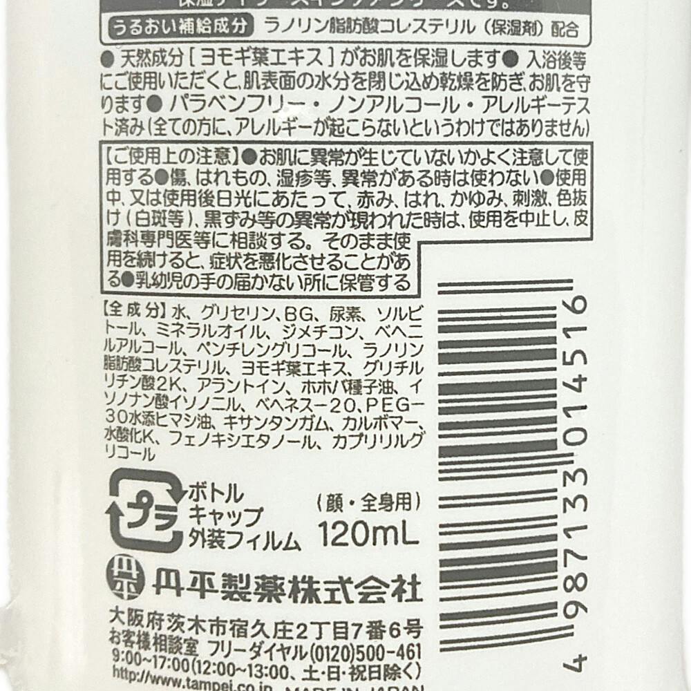 ●うるおい補給成分ラノリン脂肪酸コレステリル(保湿剤)配合。●天然成分(ヨモギ葉エキス)がお肌を保湿します。●入浴後等にご使用いただくと、肌表面の水分を閉じ込め乾燥を防ぎ、お肌を守ります。●無香料・無着色・パラベンフリー・ノンアルコール