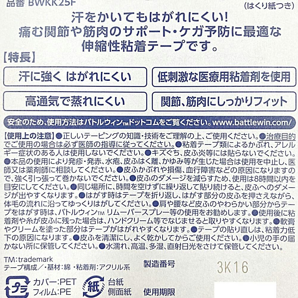 ●正しいテーピングの知識・技術をご理解の上、ご使用ください。●治療目的でご使用の場合は必ず医師の指導に従ってください。●粘着テープ類によるかぶれ、アレルギー症状のある人は使用しないでください。●キズぐち、皮ふ炎等には貼らないでください。等