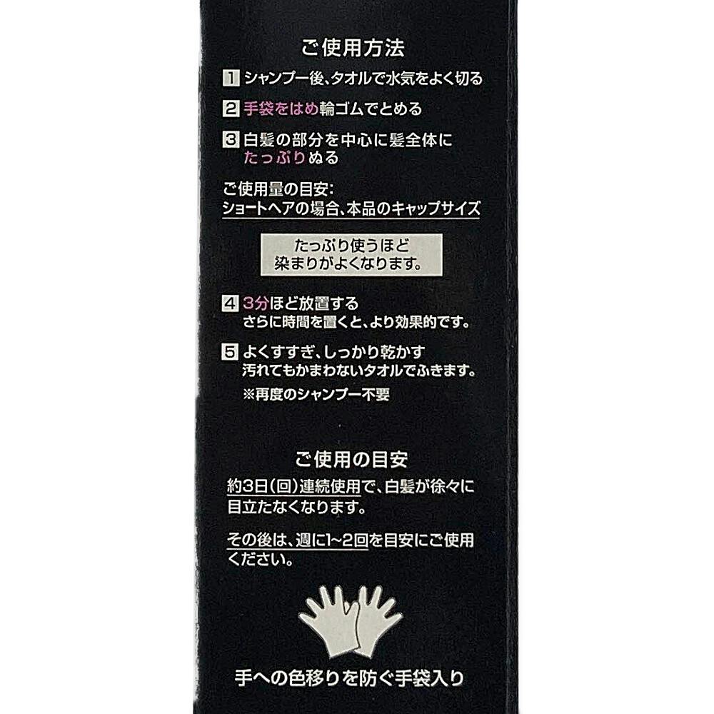 1.シャンプー後、タオルで水気をよく切る 2.手袋をはめ輪ゴムでとめる 3.白髪の部分を中心に髪全体にたっぷりぬる 4.3分ほど放置する。さらに時間を置くと、より効果的です 5.よくすすぎ、しっかり乾かす。汚れてもかまわないタオルでふきます※再度のシャンプー不要