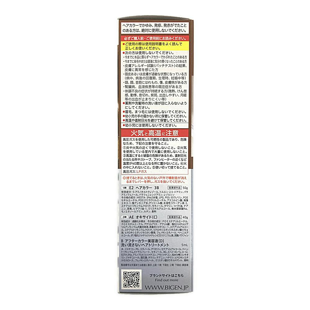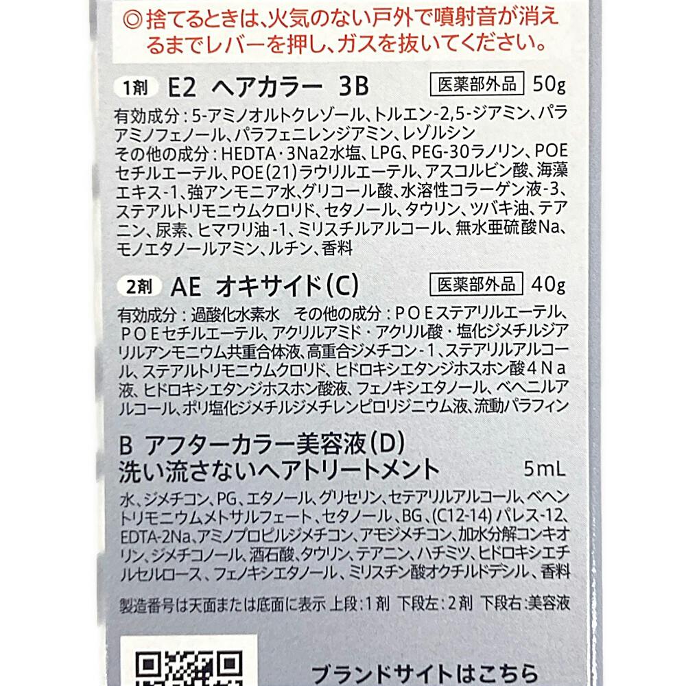 1剤 E2 ヘアカラー 3B:50g、2剤 AE オキサイド (C):40g、B アフターカラー美容液(D)洗い流さないヘアトリートメント:5mL