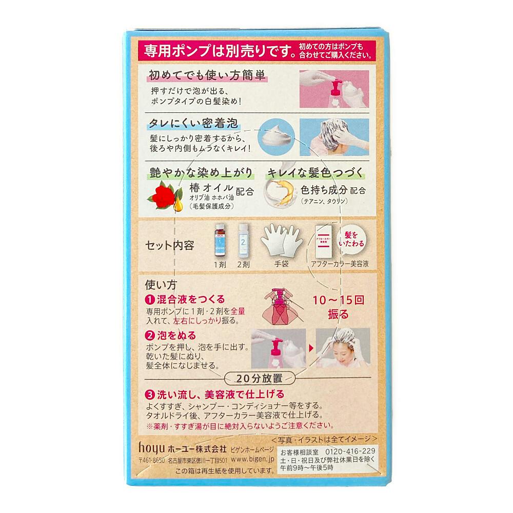 ●専用ポンプは別売りです。初めての方はポンプも合わせてご購入ください ●初めてでも使い方簡単/押すだけで泡が出る、ポンプタイプの白髪染め ●タレにくい密着泡/髪にしっかり密着するから、後ろや内側もムラなくキレイ