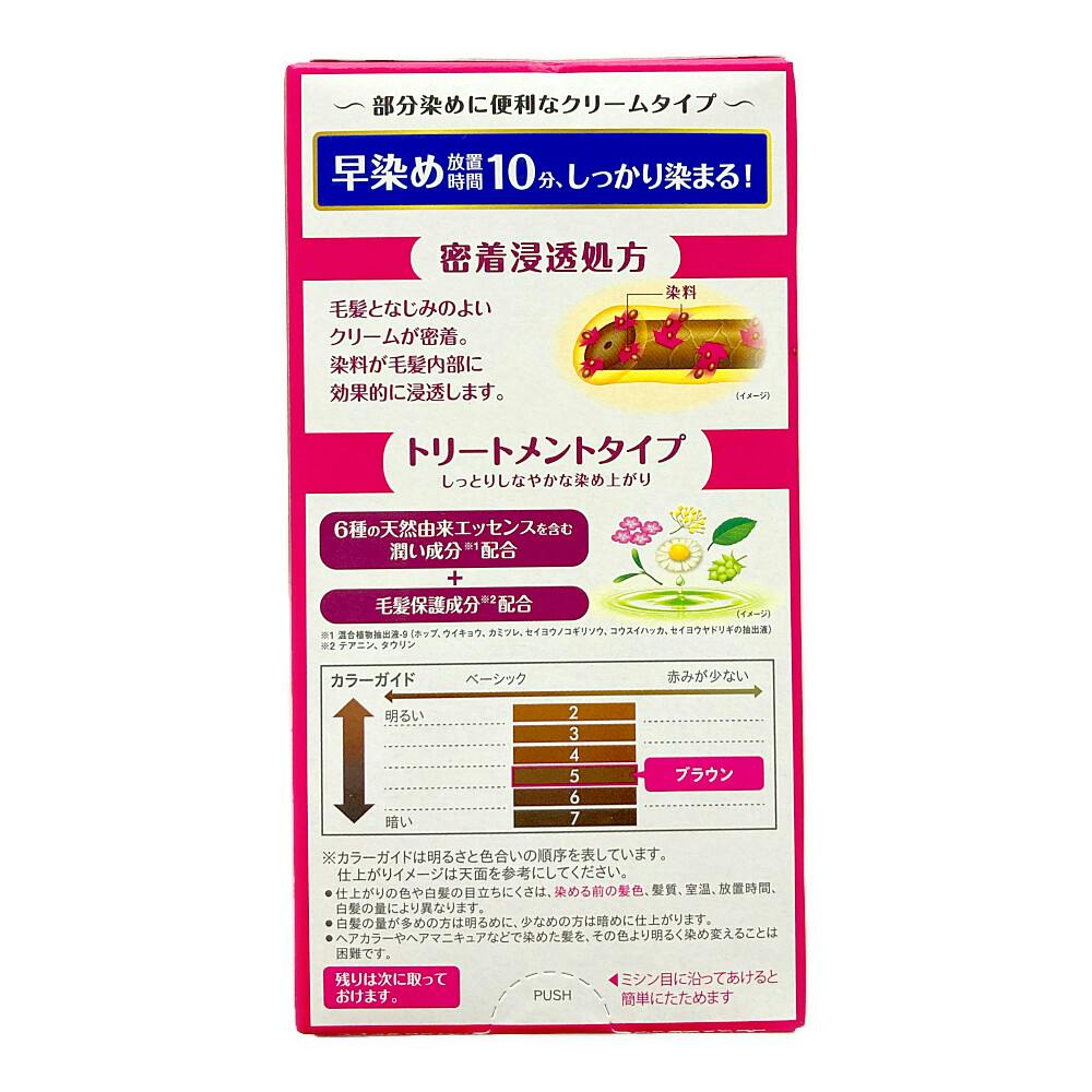 ●部分染めに便利なクリームタイプ ●早染め放置時間10分、しっかり染まる! ●密着浸透処方/毛髪となじみのよいクリームが密着。染料が毛髪内部に効果的に浸透します ●トリートメントタイプ/しっとりしなやかな染め上がり