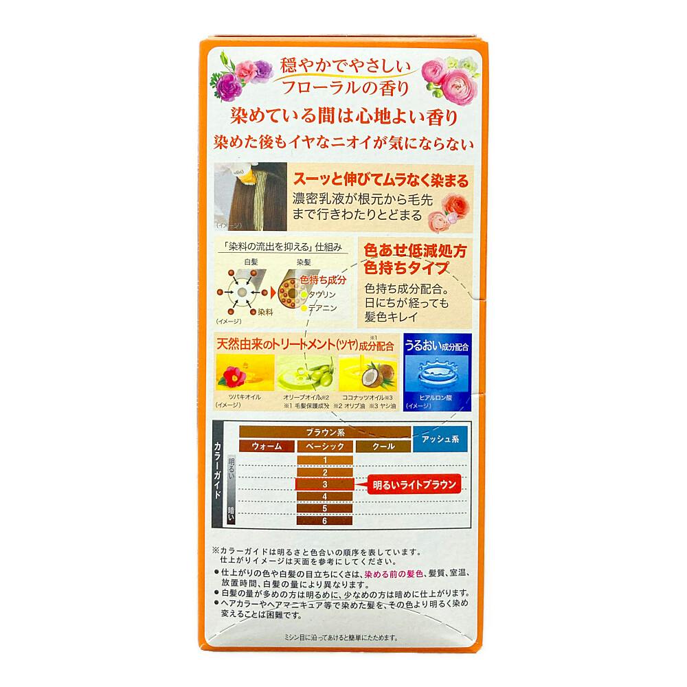 ●染めている間は心地よい香り ●染めた後もイヤなニオイが気にならない ●スーッと伸びてムラなく染まる/濃密乳液が根元から毛先まで行きわたりとどまる ●色あせ低減処方色持ちタイプ/色持ち成分配合。日にちが経っても髪色キレイ