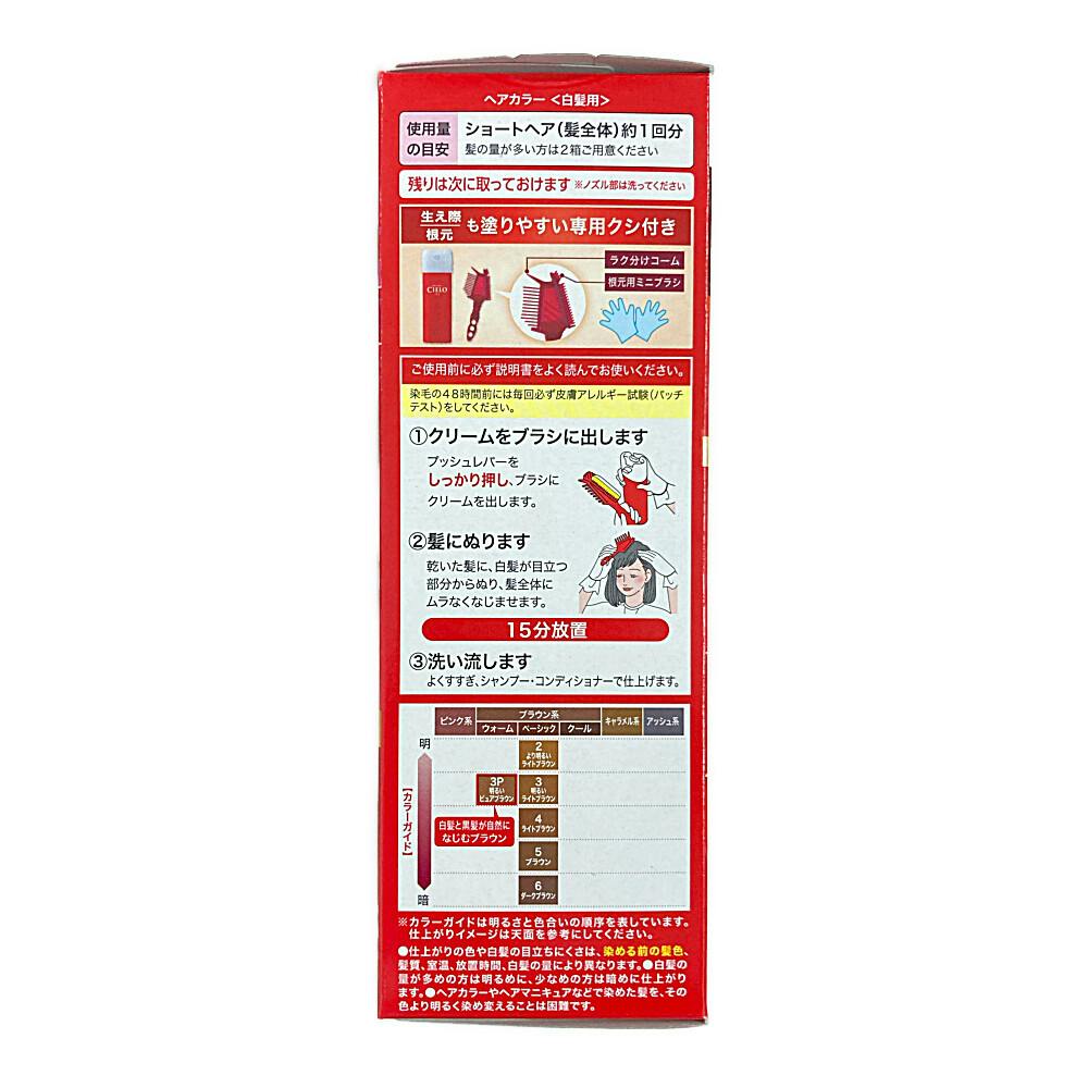 1.プッシュレバーをしっかり押し、ブラシにクリームを出します 2.乾いた髪に、白髪が目立つ部分からぬり、髪全体にムラなくなじませます (15分放置) 3.よくすすぎ、シャンプー・コンディショナーで仕上げます