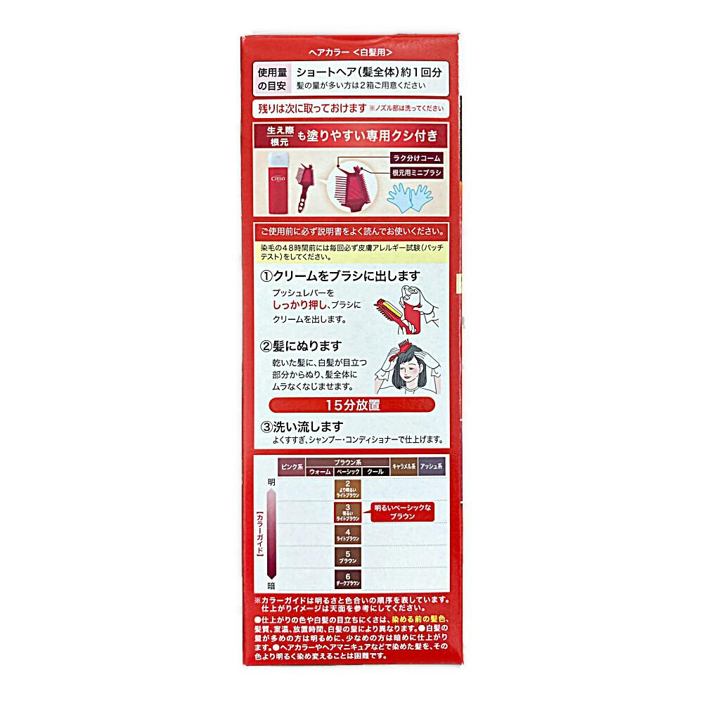 1.プッシュレバーをしっかり押し、ブラシにクリームを出します 2.乾いた髪に、白髪が目立つ部分から塗り、髪全体にムラなくなじませます(15分放置) 3.よくすすぎ、シャンプー・コンディショナーで仕上げます