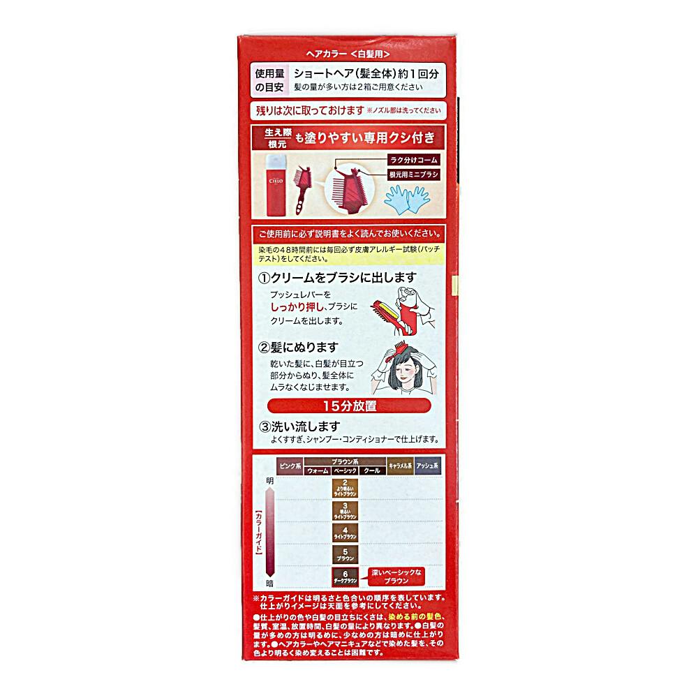 1.プッシュレバーをしっかり押し、ブラシにクリームを出します 2.乾いた髪に、白髪が目立つ部分から塗り、髪全体にムラなくなじませます(15分放置) 3.よくすすぎ、シャンプー・コンディショナーで仕上げます